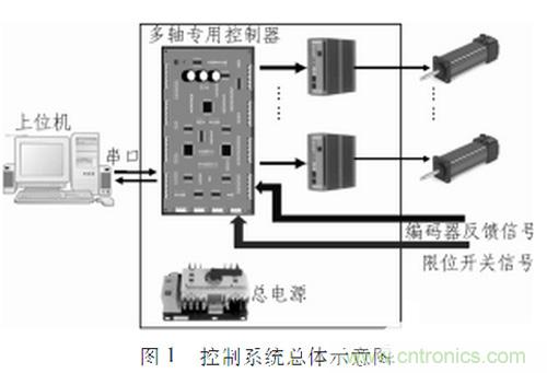 多軸控制器與上位機、電機驅動器等配合使用,圖1為采用多軸控制器組成的控制系統總體示意圖。控制器接收上位機發送的控制指令,分析處理并產生相應的方向信號、脈沖信號給驅動器,從而達到控制電機運行的目的。為了提高系統的控制精度,將電機的編碼器信號作為反饋信號輸入給控制器(內部實現自動辨向及四細分)。在各軸運動過程中,專用控制器對電機運行的絕對位移進行記錄,并且可以實時地將各軸的絕對位置信息上傳給上位機。另外在電機運行的過程中,為了保證電機運行的安全性,控制器還采用了限位信號反饋實現全硬件保護措施。