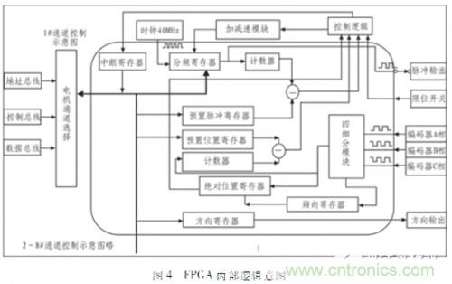 專用控制器在完成整個控制的過程中,arm只負責指令解析、控制指令發送、實時數據上傳等任務,fpga才是多軸專用控制器的核心。通過Verilog HDL語言在fpga內部實現了加減速曲線、編碼器信號辯向及四細分、絕對位移記錄等功能。圖3為電機控制的整體輸入、輸出信號圖,通過片選信號CS、讀有效信號rd_enable、寫有效圖信號wr_enable進行電機通道選擇。圖4給出了1#通道控制的fpga內部邏輯示意圖,下面將逐一對各主要模塊進行詳細介紹。