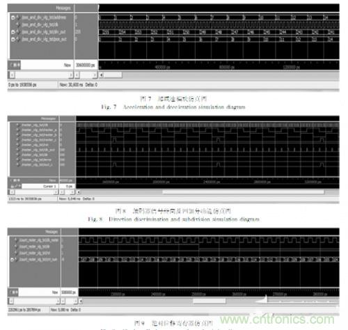 在QuartusⅡ編譯環境下成功編譯之后,調用Modulesim仿真軟件,編寫仿真程序,使之產生全局時鐘、復位信號、相位差為90度的A、B相信號和Z相信號。如圖8所示,給出了該多軸控制器中所采用的編碼器信號辯相及四細分的功能仿真圖。