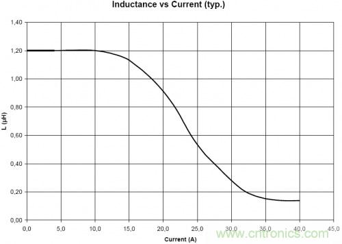 電感中直流電流的增加時,電感透磁率的數值會逐漸減少,因此電感值會緩慢下降。電感廠商會根據電感的電感值的下降程度為指標的額定電流,"基于電感值的變化率的額定電流",即Saturation Current,大部分電感廠商將電感值下降20%時的通過電感直流電流作為額定電流。下圖是Wurth公司某款電感的電感值vs電流的曲線圖。該款電感規格書上將saturation current設定為電感值下降10%時的電流值,為16.6A。如果將saturation current設定為電感值下降20%時的電流值的話,大約為18.2A。