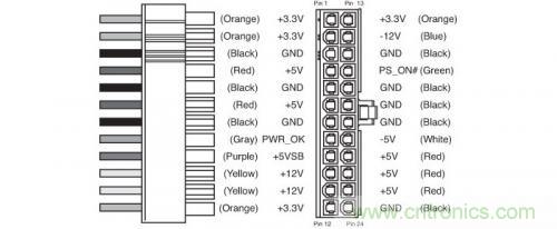 主板上的24pin供電接口就用到了PC電源上全部5種供電電壓,即+12V、+3.3V、+5V、-12V以及+5VSB,另外還有一個-5V,不過這個電壓對應的硬件和接口實際上早已淘汰,因此現(xiàn)在的PC電源已經(jīng)不再提供-5V供電,在24pin接口中的這一路僅是名義上的存在。