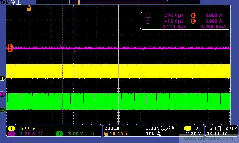 注:功率電感電流波形及高低端MOS管驅動波形。其中:①黃色:高端驅動波形;④綠色:低端驅動波形;③紫色:電感電流