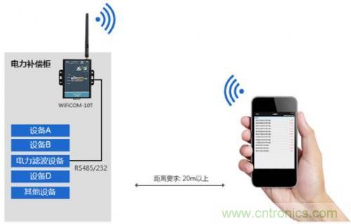 電力補(bǔ)償裝置的巡檢一般需要人工開柜進(jìn)行數(shù)據(jù)的查看、調(diào)整等操作,工作繁瑣切具有一定危險(xiǎn)性,本項(xiàng)目利用WiFiCOM-10T串口轉(zhuǎn)Wi-Fi模塊,在傳統(tǒng)裝置的基礎(chǔ)上利用原有的RS-485/232通訊接口快速進(jìn)行產(chǎn)品升級(jí),將串口數(shù)據(jù)轉(zhuǎn)化成Wi-Fi信號(hào),巡檢人員即可通過(guò)手機(jī)或iPad進(jìn)行設(shè)備巡檢,并實(shí)現(xiàn)遙控、遙測(cè)、遙信等功能。