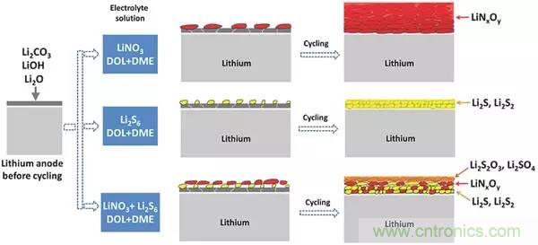 圖7.具有相同LiTFSI-DOL成分的不同電解質中鋰負極循環的表面膜行為