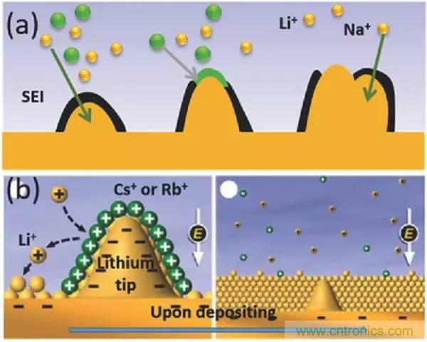 b)自愈式靜電屏蔽機制。Cs+或Rb+將積聚在尖端附近以形成靜電屏蔽,排斥Li+沉積在負極附近區域。