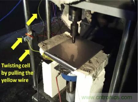 目前能夠模擬鋰離子電池內(nèi)短路的方式有多種,例如針刺測(cè)試,小壓痕測(cè)試,BAJ測(cè)試和機(jī)械擠壓測(cè)試等,通過(guò)對(duì)大尺寸方形電池特點(diǎn)的分析,Hsin Wang認(rèn)為機(jī)械擠壓測(cè)試最適合應(yīng)用方形鋰離子電池的測(cè)試上。但是在傳統(tǒng)的擠壓的測(cè)試中由于電池受到的破壞太大,幾乎所有的電池都會(huì)發(fā)生熱失控,因此傳統(tǒng)的擠壓測(cè)試對(duì)不同種類(lèi)電池安全性的“分辨率”就很低,只有通過(guò)和不通過(guò)兩種結(jié)果,只能對(duì)鋰離子電池的安全性進(jìn)行定性分析。可能兩個(gè)電池都沒(méi)有通過(guò)安全性測(cè)試,但是A電池的安全性卻要好于B電池,為了能夠準(zhǔn)確的評(píng)估不同體系電池的安全性能,Hsin Wang對(duì)傳統(tǒng)的擠壓實(shí)驗(yàn)進(jìn)行了改進(jìn),通過(guò)在電池負(fù)極極耳上施加一個(gè)拉力,讓電池產(chǎn)生大約5°的扭曲,從而減少在擠壓過(guò)程中電池受到的破壞,因此該實(shí)驗(yàn)?zāi)軌驕?zhǔn)確的評(píng)估不同種類(lèi)電池的的安全性高低。