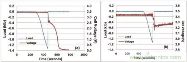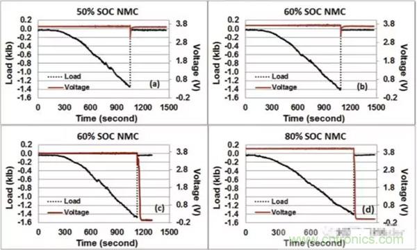 在對(duì)25Ah的NMC電池?cái)D壓-扭轉(zhuǎn)測(cè)試中,發(fā)現(xiàn)50%SoC狀態(tài)下的電池都成功通過(guò)了測(cè)試,如圖a所示,60%SoC狀態(tài)下的電池有三只通過(guò)了測(cè)試,如圖b所示,另外的三只沒(méi)有通過(guò)測(cè)試,如圖c所示,可見(jiàn)60%SoC的電池通過(guò)測(cè)試和不通過(guò)測(cè)試的概率各為50%,而80%SoC的電池則都沒(méi)有通過(guò)測(cè)試,如圖d所示。由此可見(jiàn),60%SoC是NMC電池安全性的一個(gè)分水嶺,低于這個(gè)數(shù)值時(shí)電池相對(duì)是安全的,高于這個(gè)數(shù)值,則電池在機(jī)械濫用的情況下的安全性將大大下降。