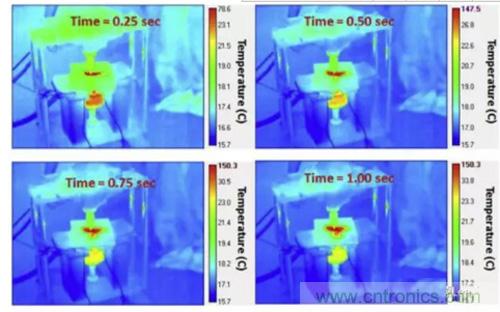 下圖為60%SoC的NMC電池在擠壓-扭轉(zhuǎn)實(shí)驗(yàn)中的熱成像圖,從圖中可以看到在短路發(fā)生后,短路點(diǎn)的溫度在0.5S內(nèi)迅速升高到了147.5 ℃,隨后高溫區(qū)域迅速向周?chē)鷶U(kuò)展,說(shuō)明周?chē)鷧^(qū)域溫度升高并不是由熱傳導(dǎo)導(dǎo)致的,而是高溫引發(fā)了其他的化學(xué)反應(yīng)。而在80%SoC下,NMC電池發(fā)生熱失控的溫度更高,引起周?chē)瘜W(xué)反應(yīng)的速度也更快。
