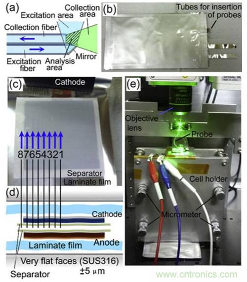實驗中Toshiro Yamanaka采用了方形疊片電池作為研究對象,電解液則采用了EC和DEC溶劑,LiClO4作為電解質鹽,為了能夠對電芯內部電解液的行為進行實時觀測,Toshiro Yamanaka在疊片鋰離子電池內部引入了8根光纖作為拉曼光譜的探測器,研究電解液在電池內的浸潤和離子濃度的變化情況,8根光纖在電池內的排布如下圖c所示: