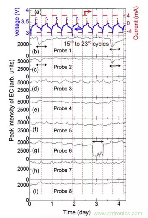 下圖則展示了8個光纖探測到的EC-Li+/EC的強度在充放電過程中的濃度變化,從下圖中可以看到,電池的不同部分EC-Li+/EC的強度變化趨勢也不相同,例如7號光纖處(電芯邊緣),EC-Li+/EC的強度隨著電池充電而增加,隨著放電而降低,而2號光纖(電芯中間)探測的結果則恰好相反,5號和6號光纖(電芯左側)處EC-Li+/EC的強度變化比較小,而1號光纖位置(電芯中央)的EC-Li+/EC的強度在前三次變化比較強烈,隨后變化開始減弱,8號光纖(電芯外部)探測器,由于在電芯的外部,因此Li+的濃度不隨著充放電而變化。說明在鋰離子電池充放電的過程中,電芯內部不同位置之間, Li+濃度變化也存在差別,Toshiro Yamanaka認為這主要是由于電池結構的不均勻造成的,例如電極之間的距離不均勻和隔膜孔隙率的不均勻。由于在Li+嵌入到正負極材料中導致的電極體積膨脹和收縮,會導致電極施加在隔膜上的壓力也不均勻,引起隔膜內的孔隙率發生變化,隔膜的離子遷移阻抗也隨之發生變化,引起個部分的EC-Li+/EC的濃度存在差異。