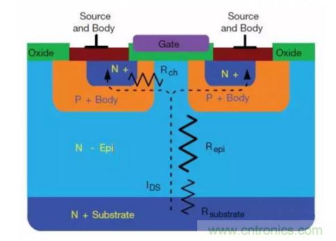 圖1顯示了一種傳統平面式高壓MOSFET的簡單結構。平面式MOSFET通常具有高單位芯片面積漏源導通電阻,并伴隨相對更高的漏源電阻。使用高單元密度和大管芯尺寸可實現較低的RDS(on)值。但大單元密度和管芯尺寸還伴隨高柵極和輸出電荷,這會增加開關損耗和成本。另外還存在對于總硅片電阻能夠達到多低的限制。器件的總RDS(on)可表示為通道、epi和襯底三個分量之和: