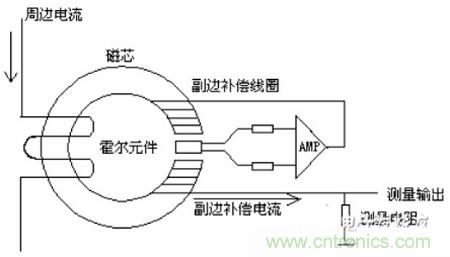 霍爾電流傳感器的原理圖如3-2。被測電流In流過導體產生的磁場,由通過霍爾元件輸出信號控制的補償電流Im流過次級線圈產生的磁場補償,當原邊與副邊的磁場達到平衡時其補償電流Im即可精確反映原邊電流In值。