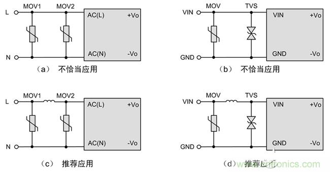 電源模塊體積小,在EMC要求比較高的場合,需要增加額外的浪涌防護電路,以提升系統(tǒng)EMC性能。如圖1所示,為提高輸入級的浪涌防護能力,在外圍增加了壓敏電阻和TVS管。但圖中的電路(a)、(b)原目的是想實現(xiàn)兩級防護,但可能適得其反。如果(a)中MOV2的壓敏電壓和通流能力比MOV1低,在強干擾場合,MOV2可能無法承受浪涌沖擊而提前損壞,導(dǎo)致整個系統(tǒng)癱瘓。同樣的,電路(b),由于TVS響應(yīng)速度比MOV快,往往是MOV未起作用,而TVS過早損壞。