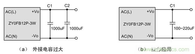如圖2中的電路(a)所示,一個3W的模塊,輸出使用了2000uF的電容,而通過查閱產(chǎn)品手冊了解到,模塊建議最大輸出電容為800uF。輸出電容過大可能導(dǎo)致啟動不良,而對于不帶短路保護的微功率DC-DC模塊,輸出電容過大甚至可能導(dǎo)致模塊永久損壞。
