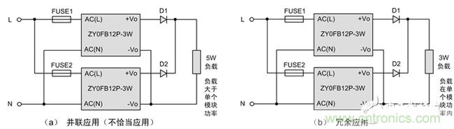 如上圖電路(a)所示,負載需5W功率,超出單個模塊的帶載能力,則其中一個模塊可能存在超負荷使用的情況。對于此種應(yīng)用,需使用單個大于5W功率的模塊,比如ZY0JGB12P-10W。而電路(b)則不然,每個模塊的功率均能滿足負載的需要,此時屬于冗余設(shè)計。