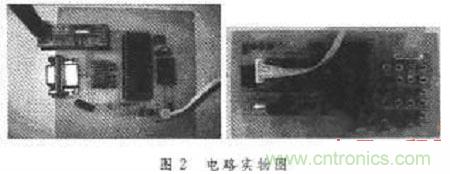對應于上述框圖的電路實物圖如圖2所示。其左右兩個電路分別對應上述框圖中的左右兩個部分。總體來說,它包括電平轉換電路、單片機處理部分、無線收發部分(CCll00收發器 )、液晶顯示模塊和鍵盤輸入模塊五個部分。
