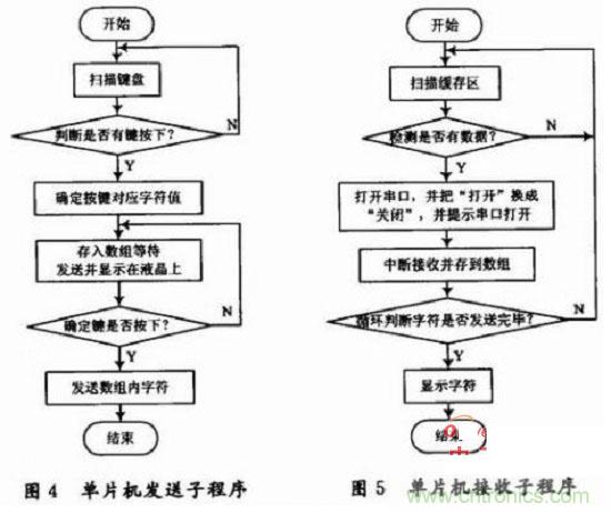 單片機程序主要包括主程序、單片機發送子程序、單片機接收子程序、液晶顯示子程序、鍵盤輸入子程序五部分,均采用C語言進行模塊化編程。由于篇幅原因,下面只給出了單片機發送子程序和接收子程序,如圖4,圖5所示。
