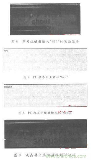 測試時,連接好硬件打開串行口COM1,并設波特率為9600b/s.單片機發送字符串“675”給PC機,其液晶顯示如圖6所示,相應的PC機界面顯示如圖7所示。PC機發送“69asd”給單片機,液晶屏上即可接收到“69asd”,如圖8,圖9所示。測試結果說明:基于串行口的PC機與單片機之間的雙工無線通信是切實可行的,而且無線傳輸的距離至少可達到100m.