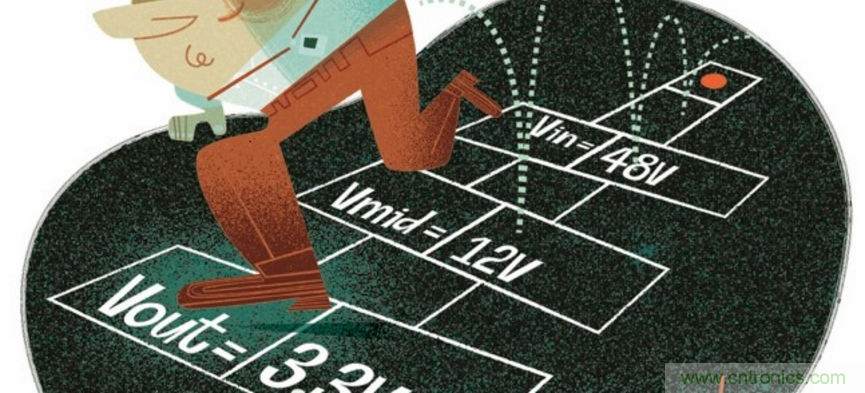 圖2 在2個(gè)步驟下電壓從48伏特轉(zhuǎn)換成3.3伏特,過程中還用到一個(gè)12伏特的中間電壓。