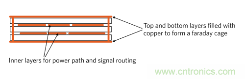 b.PCB 的頂層和底層布局帶有屏蔽接地區域,利用一個過孔將其連接起來,以模擬法拉第籠。所有高 di/dt 環路布置在 PCB 的內層,所以法拉第籠就能夠屏蔽電磁場, 防止向外輻射。該方法成本較低,通常足以抑制 EMI。圖 10 為該技術的示意圖。