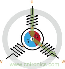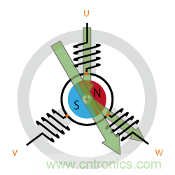 圖3:轉(zhuǎn)子的永久磁石會(huì)像被合成磁通量牽引一樣旋轉(zhuǎn),電機(jī)的軸也會(huì)因此旋轉(zhuǎn)