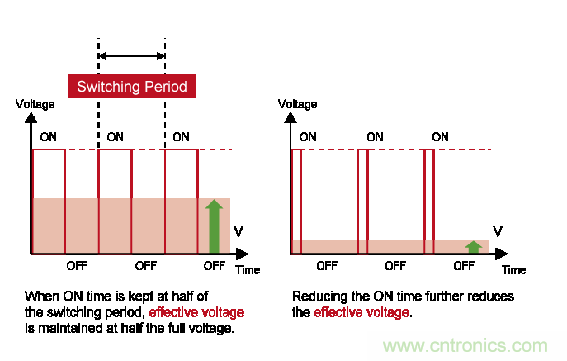 ON時(shí)間越長(zhǎng),有效值越接近施加100%電壓時(shí)(ON時(shí))的電壓