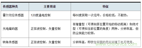 表1中顯示的是BLDC電機(jī)主要的位置檢測(cè)用傳感器的種類(lèi)。根據(jù)控制方式的不同,需要的傳感器也是不同的。在120度通電控制中,為判斷要對(duì)哪個(gè)相通電,配備了可每60度輸入一次信號(hào)的霍爾效應(yīng)傳感器。另一方面,對(duì)于精密控制合成磁通量的“矢量控制”(在下一項(xiàng)中說(shuō)明)來(lái)說(shuō),轉(zhuǎn)角傳感器或光電編碼器等高精度傳感器較為有效。