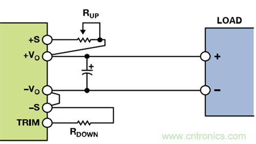 輸出電壓可通過改變連接電源模塊正輸出端或接地端的電阻來進行調節。通過連接外部電阻RUP并使RDOWN浮空,可以向上調整輸出電壓(高于標稱輸出電壓),或者通過連接外部電阻RDOWN并使RUP短路(電阻值為零)向下調整(低于標稱輸出電壓)。