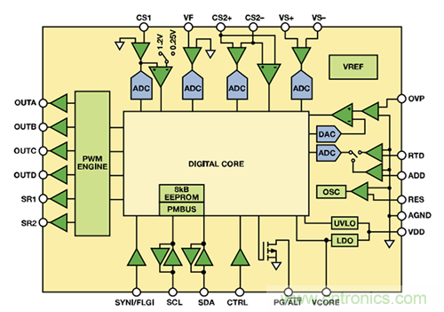 對于數字控制器來說,所有的控制功能均由數字邏輯實現。圖3所示為集成PMBus接口的高級數字控制器ADP1051的功能框圖。該器件非常適合高密度DC-DC電源轉換,具有6個可編程脈沖寬度調制 (PWM) 輸出,可控制大部分高效電源拓撲。另外,該器件還能控制同步整流 (SR),并集成6個模數轉換器 (ADC),能夠采樣模擬輸入電壓、輸入電流、輸出電壓、輸出電流、溫度以及其它參數。轉換為數據后,將這些信號發送至數字內核模塊進行處理。該器件采用靈活的狀態機架構,以硬件實現全部功能,提供穩定可靠的解決方案,但無法通過編程實現設計以外的功能。器件的全部功能—包括輸出電壓調整—均以數字方式處理。為了調整輸出電壓,應通過PMBus接口發送一條命令,改變數字基準電壓值。