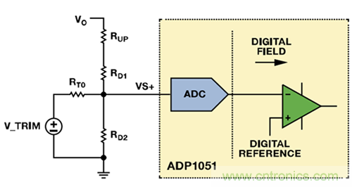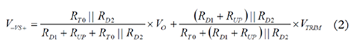 VS+引腳上的正常工作電壓為1 V。若VTRIM為1 V左右且RT0遠大于RD2,則可忽略電路的其余分支部分。復合網絡用作簡單分壓器,并調節RUP電阻值,提供類似于模擬控制器的特性,實現了模擬電源模塊中的電壓向上調整。
