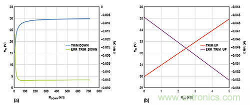 圖6. 使用重新配置的反饋網絡后,調整ADP1051輸出電壓的計算結果:(a) 向下調整 (b) 向上調整