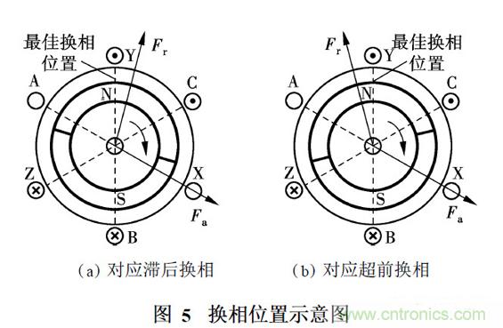最佳換相邏輯是指繞組在梯形波反電勢(shì)的平頂部分導(dǎo)通, 與之對(duì)應(yīng)的最佳換相位置是指在換相完成后,定子磁勢(shì)超前轉(zhuǎn)子磁勢(shì)120°電角度,如圖5所示. 其中, Fa 和Fr 分別表示定子磁勢(shì)和轉(zhuǎn)子磁勢(shì). 在一個(gè)工作狀態(tài)內(nèi)定子磁勢(shì)平均超前轉(zhuǎn)子磁勢(shì)90°電角度,平均電磁轉(zhuǎn)矩最大.