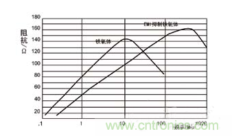 鐵氧體的效果隨著頻率的升高而增加。鐵氧體扼流圈的阻抗在10MHz處通常為幾十歐姆,當頻率超過100MHz時,阻抗升高到數百歐姆(具體值取決于形狀和尺寸,鐵氧體體積越大,阻抗越大)。不同廠家的產品或同一廠家的不同種類的鐵氧體,其阻抗隨頻率的變化都有所不同。圖5是尺寸相同(外徑為5mm,長度為11mm)但材料不同的兩種鐵氧體的特性。