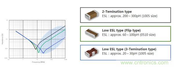 因此,TDK建議采用低ESL型電容來降低去耦電容的數量和減少貼裝面積。低ESL型電容是低電感成分(ESL)的產品,在從低頻到高頻的寬頻帶實現了低阻抗。因此,大量使用通常型電容才能實現的阻抗特性,低ESL型電容只需很少的數量即可實現。