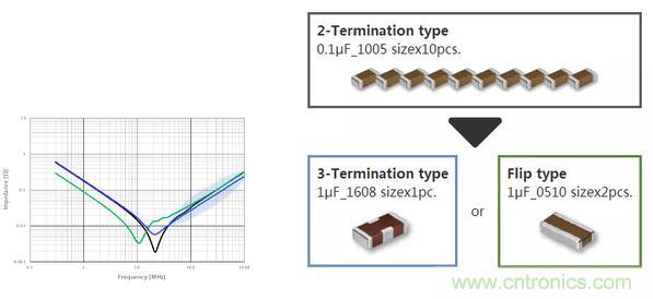 為了抑制電壓波動,需要降低阻抗。此處將介紹為了在基板尺寸以及貼裝區域等受到嚴格限制的情況下實現所需要的阻抗特性,TDK所提出的通過替換為低ESL產品來減少去耦電容數量的方案。