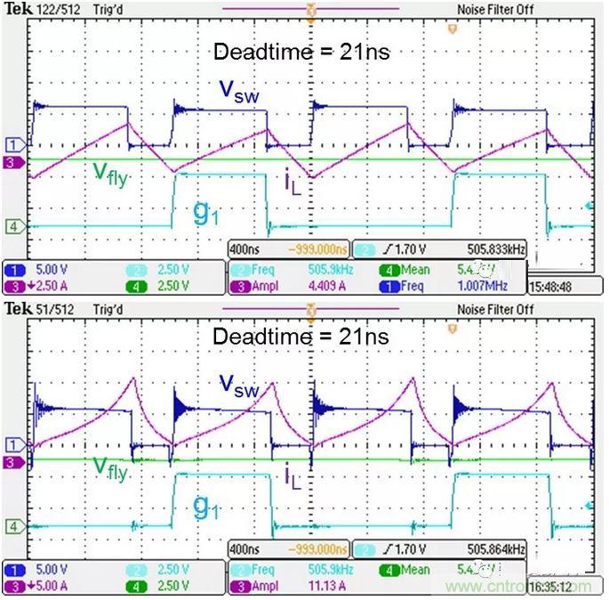 對(duì)于half bridge 實(shí)現(xiàn)ZVS turn on,我們希望當(dāng)上管Q1開(kāi)啟時(shí)電流是流進(jìn)switching node (vsw)的,也就是圖中電感電流為負(fù)值,當(dāng)下管Q2開(kāi)啟時(shí)我們希望電流是流出switching node (vsw)的,也就是電感電流為正值。為什么這樣就可以實(shí)現(xiàn)ZVS turn on了呢?我們就看上管Q1開(kāi)啟過(guò)程。如果電感電流iL為負(fù),這時(shí)候我們先關(guān)閉Q2,這時(shí)候Q1還未開(kāi)啟,在這個(gè)deadtime中iL會(huì)charge Q2的Coss,使Vsw抬高到Vin,當(dāng)然不能超過(guò)Vin,因?yàn)镼1的body diode會(huì)導(dǎo)通,鉗位住Vsw到Vin,這時(shí)候Q1的Vds就是Vin-Vsw=0,這時(shí)候我們開(kāi)啟Q1就實(shí)現(xiàn)ZVS了。同理對(duì)于Q2開(kāi)啟時(shí),如果電感電流為正,那么當(dāng)我們首先關(guān)閉Q1管時(shí),Vsw就會(huì)被電感電流拉低到0,因?yàn)閕L》0, Q2的Coss會(huì)discharged到0,然后我們?cè)匍_(kāi)啟Q2,就可以達(dá)到ZVS了。這里我有一張其他Topology的PWM converter的波形圖,也和buck工作原理類(lèi)似,大概可以看看基本原理,也就是電感電流為負(fù)時(shí),Q1可以實(shí)現(xiàn)ZVS,讓Vsw的ringing比較小。而當(dāng)電感電流為正時(shí),實(shí)現(xiàn)不了ZVS,Vsw的ringing就比較大了。