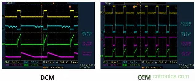 1)變壓器初級電流,CCM模式是梯形波,而DCM模式是三角波。