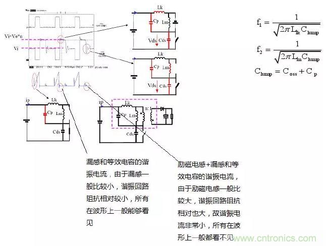 f1比f2大很多(從波形上可以看出),這是由于漏感一般相對較小;同時由于f1所在回路阻抗比較小,諧振電流較大,所以能夠很快消耗在等效電阻上,這也就是為什么f1所在回路很快就諧振結束的原因!(具體諧振時間可以通過等效模型求解:二次微分方程估算)