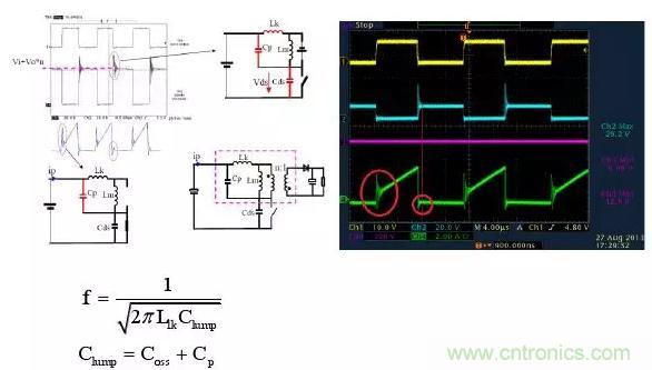 不管是在CCM模式還是DCM模式,在mosfet關斷off時刻,變壓器副邊電流IS波形都有一些震蕩。主要原因是次級電感+肖特基接電容+輸出電容之間的諧振造成的。
