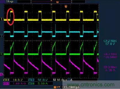 不管是在CCM模式還是DCM模式,在mosfet開通on時刻,變壓器副邊都有震蕩。主要原因是初次及之間的漏感+輸出肖特基(或快恢復)結電容+輸出電容諧振引起,在CCM模式下與肖特基的反向恢復電流也一些關系。故一般在輸出肖特基上并聯-一個RC來吸收,使肖特基應力減小。