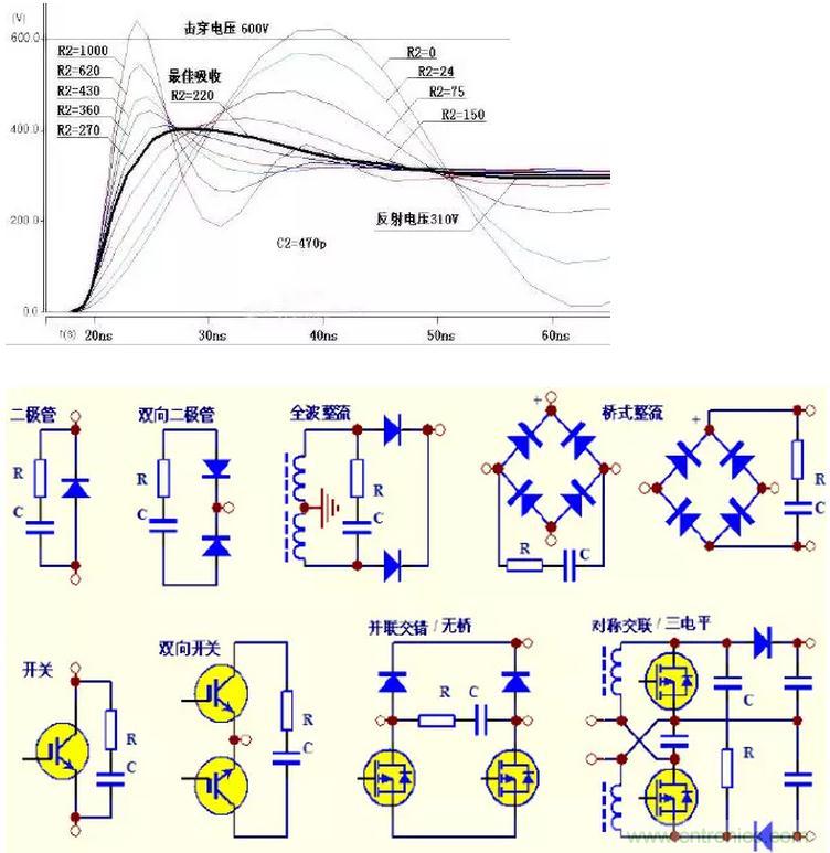 比如對二極管反壓的吸收,即使其他情況完全相同,使用不同的二極管型號需要的RC吸收參數就可能有很大差距。很難推導出一個通用的計算公式出來。