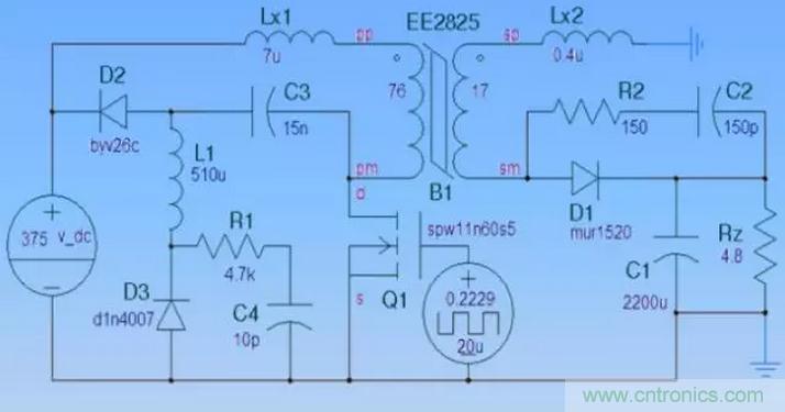 同時將Q1、D1的電壓尖峰、振鈴減少到最低程度。