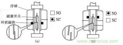 圖(b):當水位上升時,環狀磁鐵上移使磁簧開關處于斷開狀態。