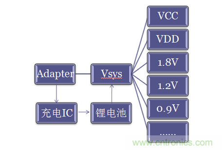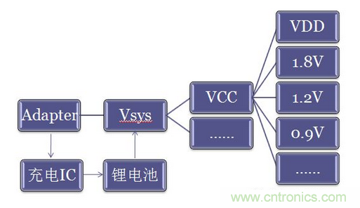 下圖為一般電源管理系統,原始分立電源管理系統,模型一: