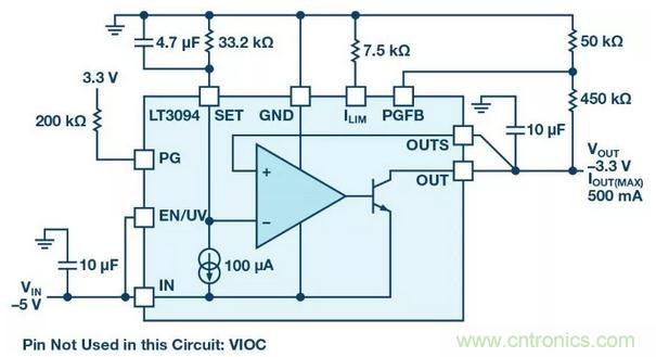 LT3094采用小尺寸、低成本的10μF陶瓷輸出電容工作,可優化穩定性和瞬態響應。利用單個電阻器可編程外部精密電流限值(±10%過溫)。該器件的VIOC引腳可控制前端穩壓器,以最大限度地降低功耗并優化PSRR。單個SET引腳電容可降低輸出噪聲,并提供基準軟啟動功能,防止輸出電壓在開啟時過沖。此外,該器件的內部保護電路還包括具有折返功能的內部限流和帶遲滯的熱過載。其他功能包括快速啟動功能(如果使用的SET引腳電容值較大,則非常有用)和電源良好標志(業界首款具有此功能的負輸出LDO穩壓器),具有可編程閾值,用于指示輸出電壓調節。