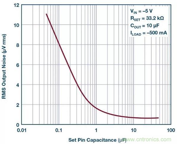 LT3094需要一個輸出電容才能保持穩定性。鑒于其高帶寬,建議使用低ESR和ESL的陶瓷電容。為達到穩定性,要求輸出電容最小值為10μF,ESR小于30mΩ,ESL小于1.5 nH。由于使用單個10μF陶瓷輸出電容可獲得高PSRR、低噪聲性能,而較大的輸出電容值僅僅略微提高了性能,因為穩壓器帶寬隨著輸出電容的增加而降低,因此,使用比最小輸出電容值10μF更大的輸出電容并不會獲得多大的收益。盡管如此,較大的輸出電容值確實會降低負載瞬變期間的峰值輸出偏差。