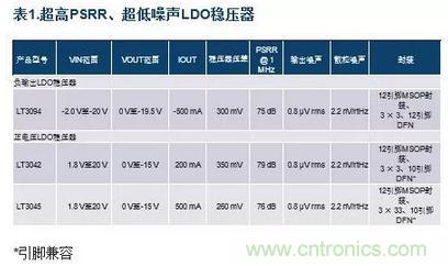 表1所示為ADI的超高PSRR、超低噪聲系列LDO穩壓器的產品成員。