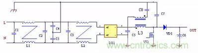 在0.15MHz~1MHz 的頻率范圍內,騷擾主要以共模的形式存在,在1MHz~10MHz 的頻率范圍內,騷擾的形式是差模和共模共存,在10MHz 以上,騷擾的形式主要以共膜為主。傳導發射的差模騷擾的產生主要是由于開關管工作在開關狀態,當開關管開通時,流過電源線的電流線形上升,開關管關斷時電流突變為0,因此流過電源線的電流為高頻的三角脈動電流,含有豐富的高頻諧波分量,隨著頻率的升高,該諧波分量的幅度越來越小,因此差模騷擾隨頻率的升高而降低,另外,如下圖1 所示,由于電容C5 的存在,它與電感L3 組成低通濾波器,因此,差模傳導騷擾主要存在低頻率段。