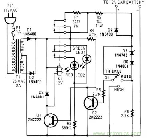 不管是一個低電流(50毫安),還是高電流(1安培),該電路都有能力提供。你可以選擇手動充電或者自動模式。當電流很低的時候,你可以在選擇高電流充電之前先用低電流。如果電池的電壓過低,齊納二極管D5將有足夠的電流來產生一個穿過R6的電壓從而使得Q2開啟。