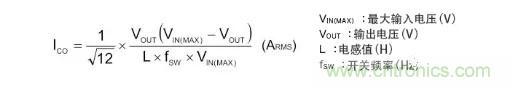 輸出電容器的紋波電流如上圖的ICO所示是三角波,而其實效值則用下面公式表示。